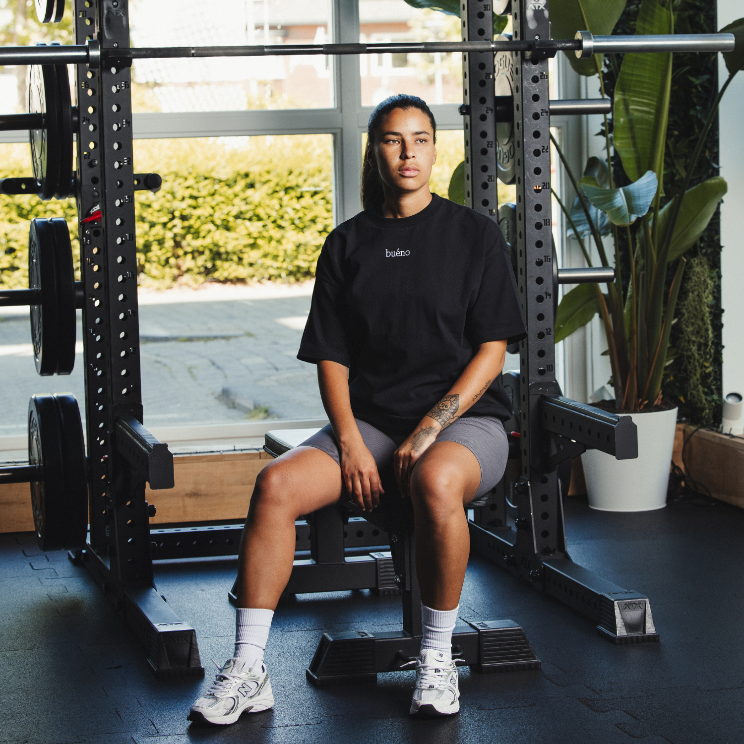 Oversized black shirt featuring white 'buéno' embroidery on the front and a bold white “LIFTING OFF” print with an astronaut graphic on the back.